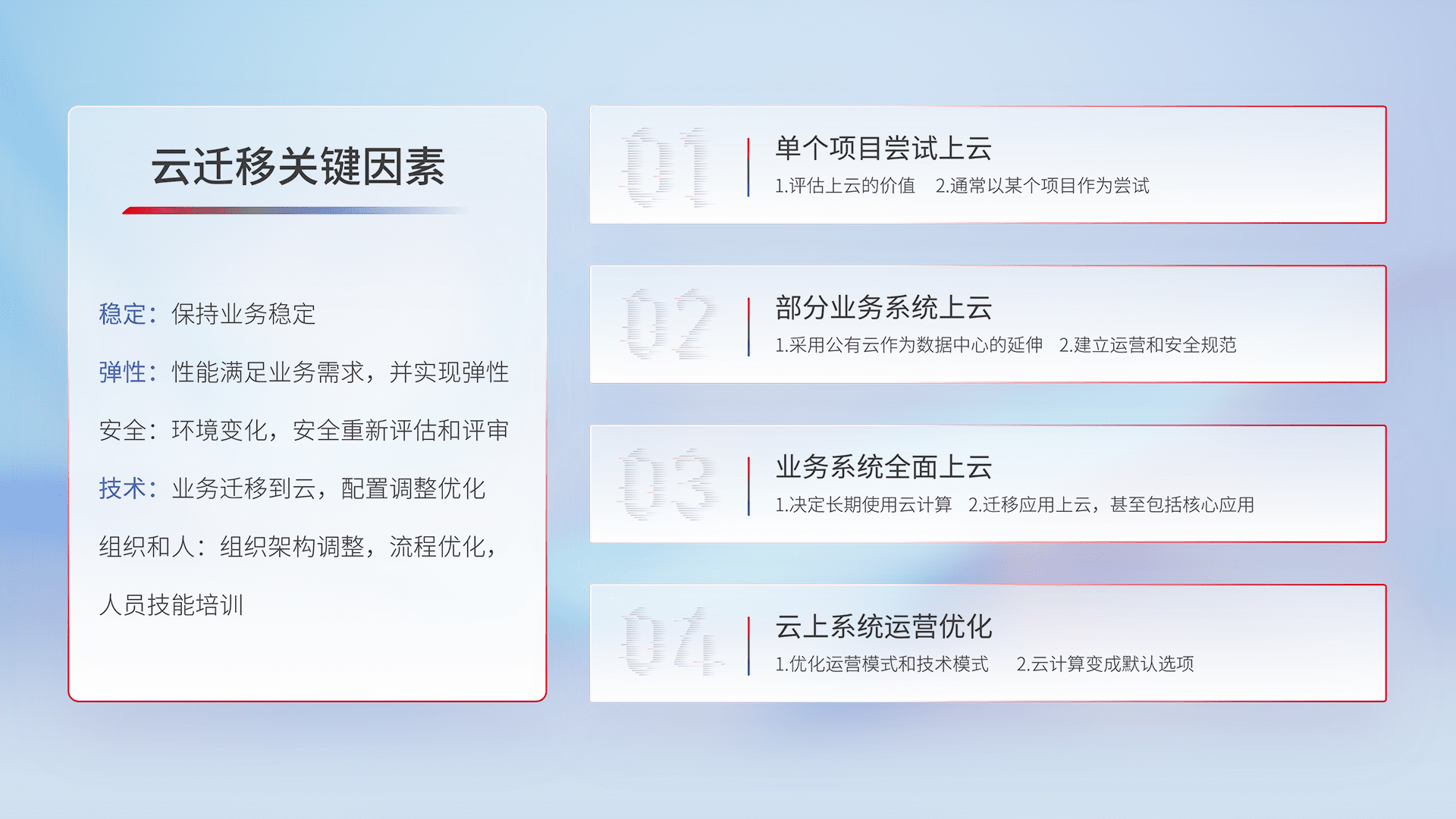 结合实际业务,,从规划设计、、、云平台选型、、云原生改造、、、数据迁移、、集成交付,,迁移全过程为客户识别最佳上云路径,,,做好风险识别管理,,,设计网络架构、、、身份权限、、、安全审计合规、、、操作审计、、、日志审计、、监控告警策略、、、多站点容灾设计等,,,,对云上基础设施进行整体规划,,,提升IT治理水平,,以满足弹性、、、、高可用、、高性能的需求。。